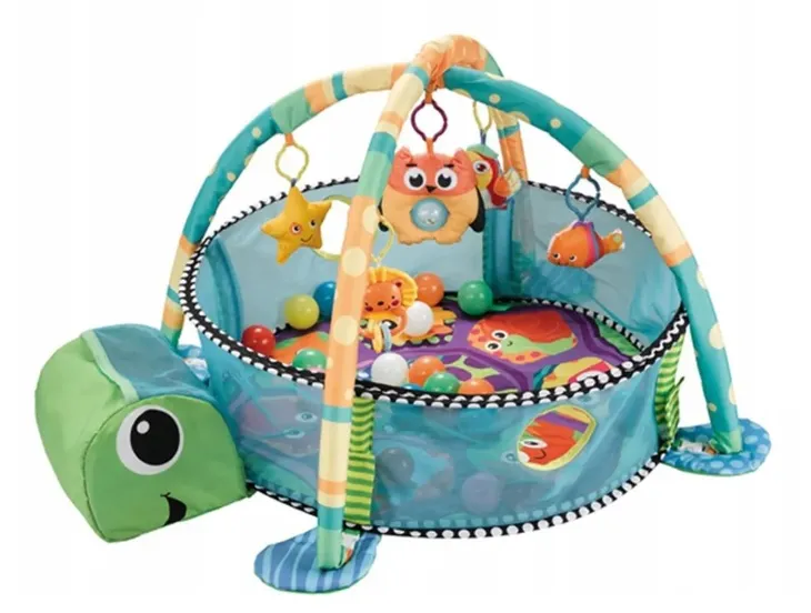 - Zestaw Zawiera: Matę edukacyjną w kształcie żółwia, pałąki, zestaw interaktywnych zabawek (lusterko, pluszowe zwierzątka, gryzaki), kolorowe piłeczki.